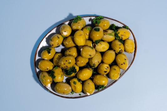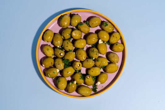 Grüne Oliven mit Petersilie und Knoblauch eingelegt