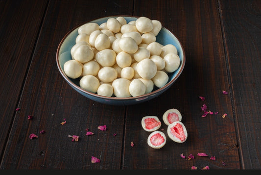 Granatapfel Mandel Kugeln mit weißer Schokolade
